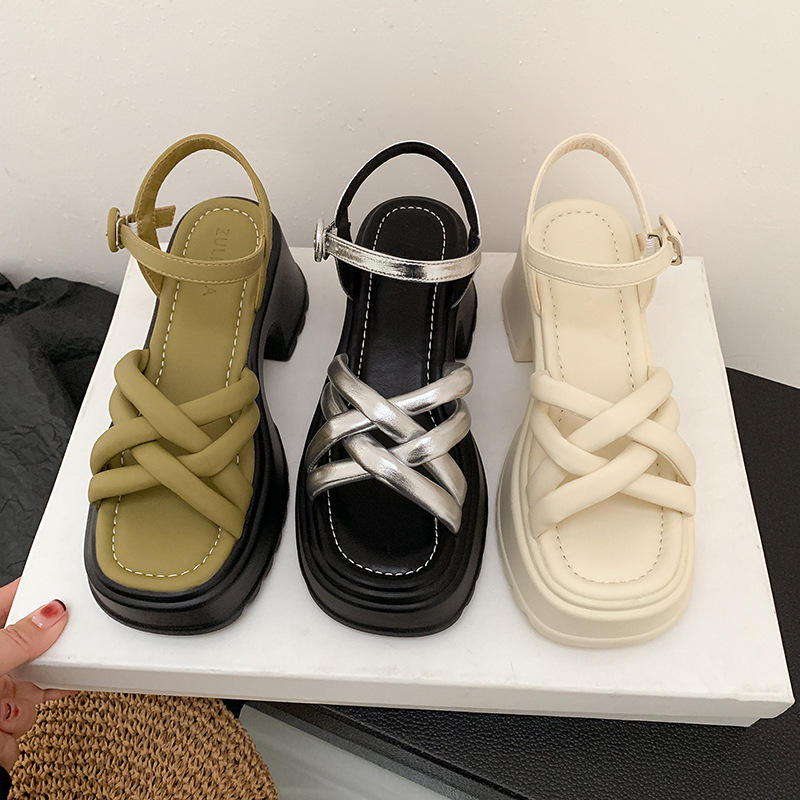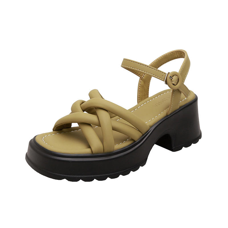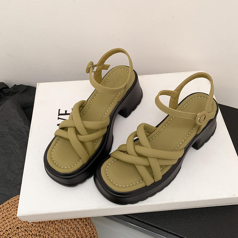 รองเท้าส้นสูงสีเขียวแบบสานสำหรับผู้หญิง แบบผูกเชือก เปิดนิ้วเท้า ส้นหนา ระบายอากาศได้ดี กันลื่น แฟชั่นสำหรับใส่กลางแจ้ง