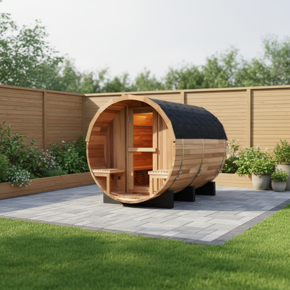 เตาซาวน่าไฟฟ้าแบบเปียก Helius HL-BRLP-240 สำหรับ 6-8 คน ทำจากไม้ซีดาร์แดง/สน พร้อมเตาทำความร้อน สำหรับพักผ่อนกลางแจ้งในวิลล่า
