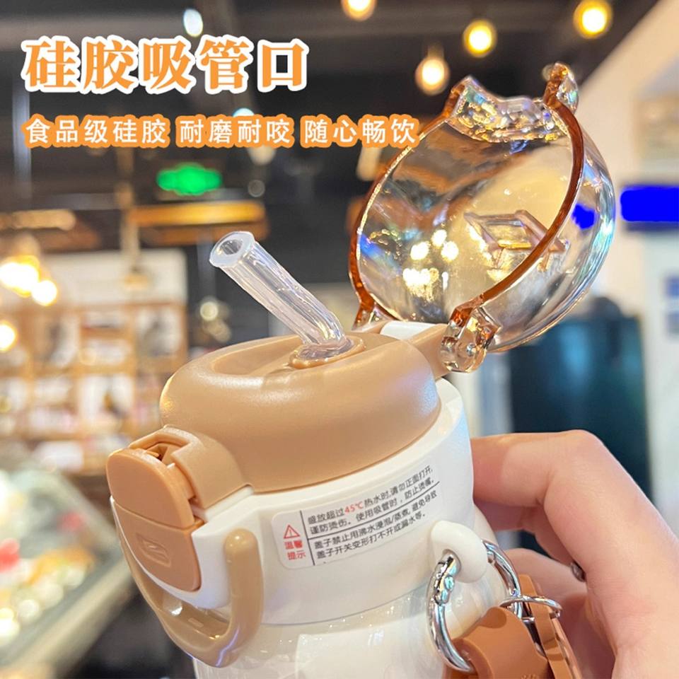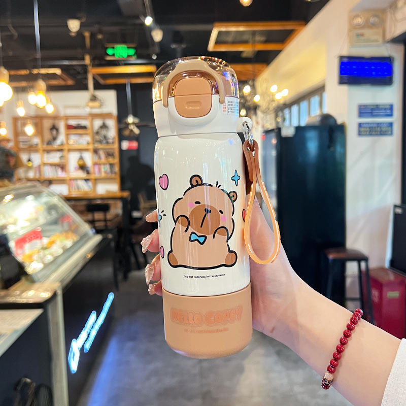 ขวดน้ำเก็บอุณหภูมิ Hello Cappy ขนาด 500 มล. ทำจากสแตนเลส พร้อมหลอดดูด สำหรับเด็กนักเรียน สีน้ำตาลและสีขาว