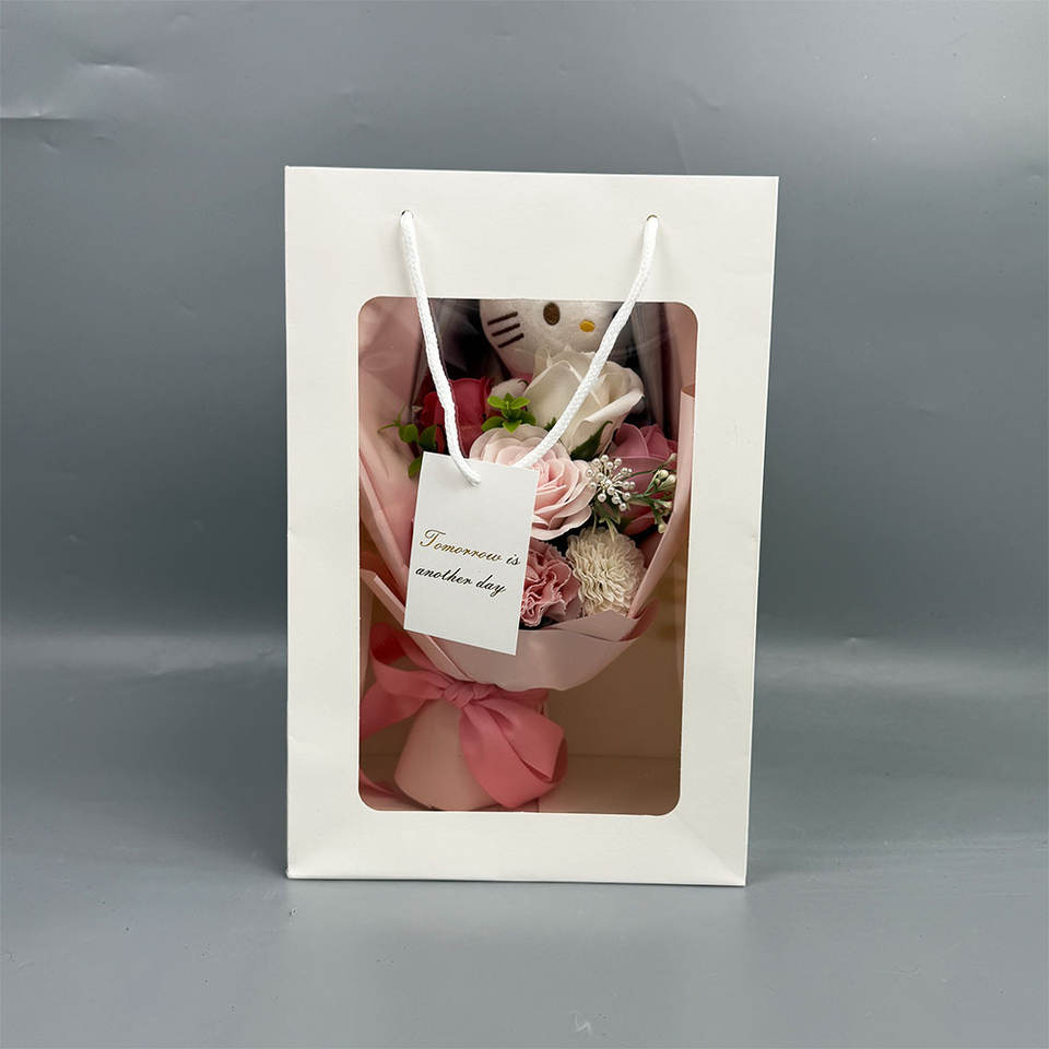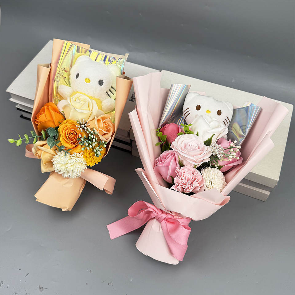 Hello Kitty Cat ช่อดอกไม้ประดิษฐ์พร้อมบรรจุภัณฑ์ใสสำหรับเทศกาลคริสต์มาสวันวาเลนไทน์วันแม่วันขอบคุณพระเจ้า