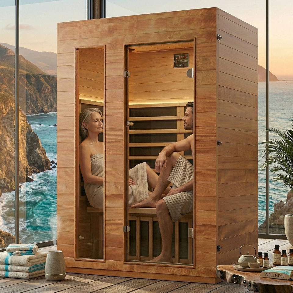 ห้องซาวน่าอินฟราเรดไม้เฮมล็อคสำหรับ 2 คน พร้อมระบบบำบัดในร่ม ปรับอุณหภูมิได้ตั้งแต่ 68 องศาฟาเรนไฮต์ ถึง 149 องศาฟาเรนไฮต์ แผงควบคุมอัจฉริยะแบบ LED