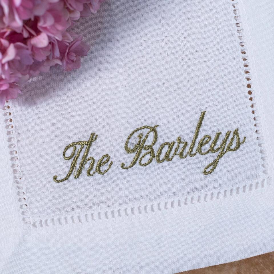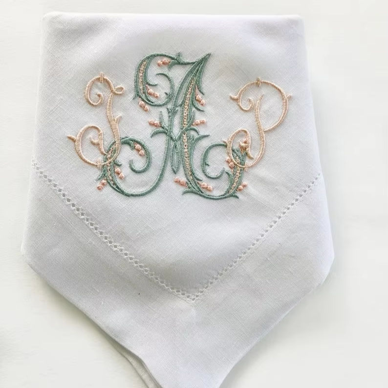 Hemstitch ผ้าเช็ดปากชาคุณภาพสูงผ้าลินินปักด้วยมือลายอักษรย่อสำหรับดินเนอร์สำหรับงานแต่งงาน
