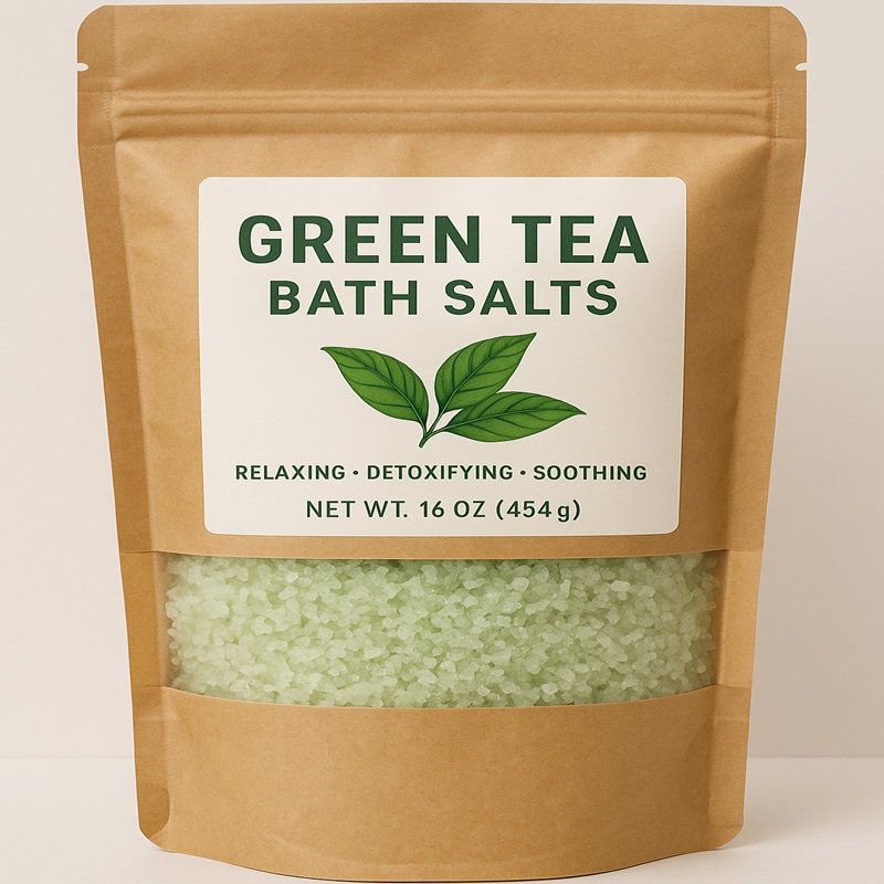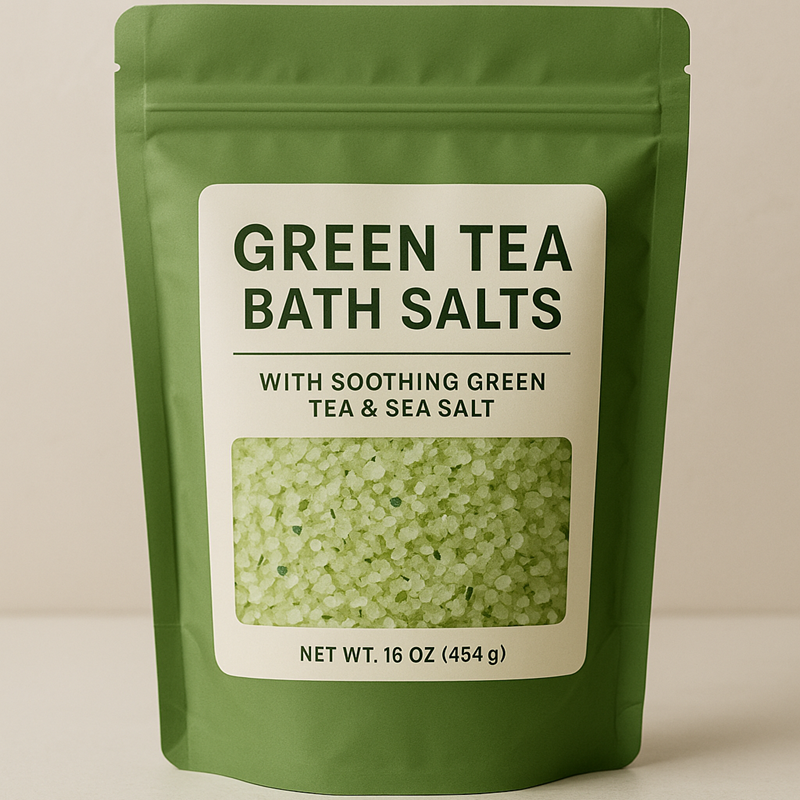 สมุนไพรชาเขียวเกลืออาบน้ำพร้อมน้ำมันหอมระเหย | เกลือแช่สปาธรรมชาติสำหรับดีท็อกซ์ผิวและผ่อนคลาย | ฉลากส่วนตัว