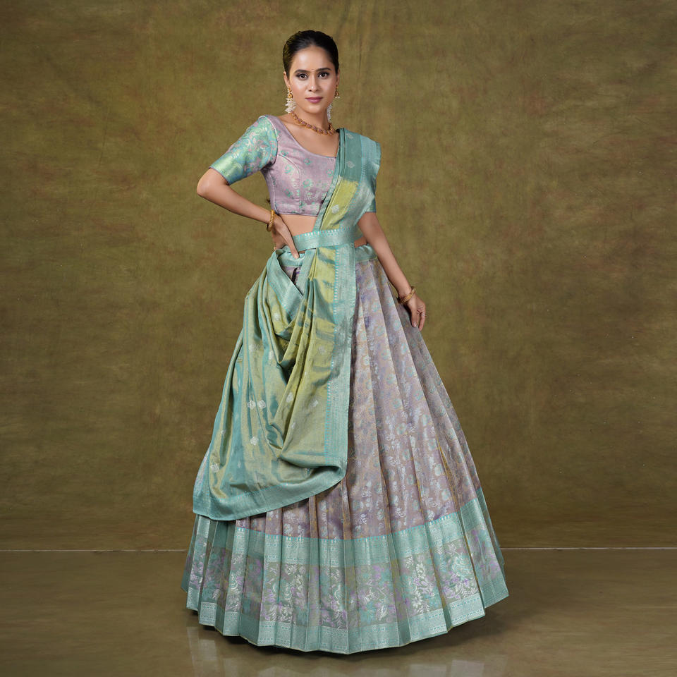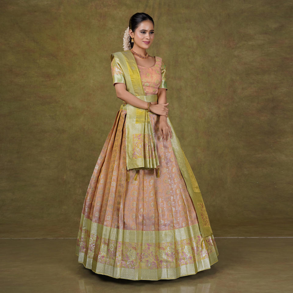 ชุดเลเฮนกาโชลีผ้าไหมบานาราสีที่ได้รับแรงบันดาลใจจากวัฒนธรรมโบราณ พร้อมงานทอมือแบบราชวงศ์ ความยาวระดับพื้น สำหรับเจ้าสาวในงานแต่งงาน