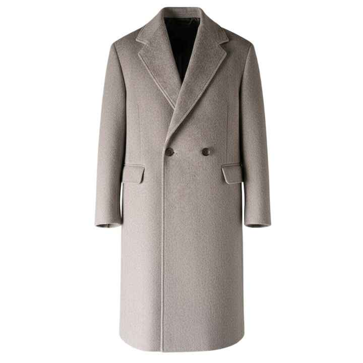 เสื้อโค้ทขนสัตว์ลายก้างปลาแบบยาวสำหรับผู้ชาย สีเทา ติดกระดุมสองแถว ดีไซน์ทันสมัยและผ้าคุณภาพสูง