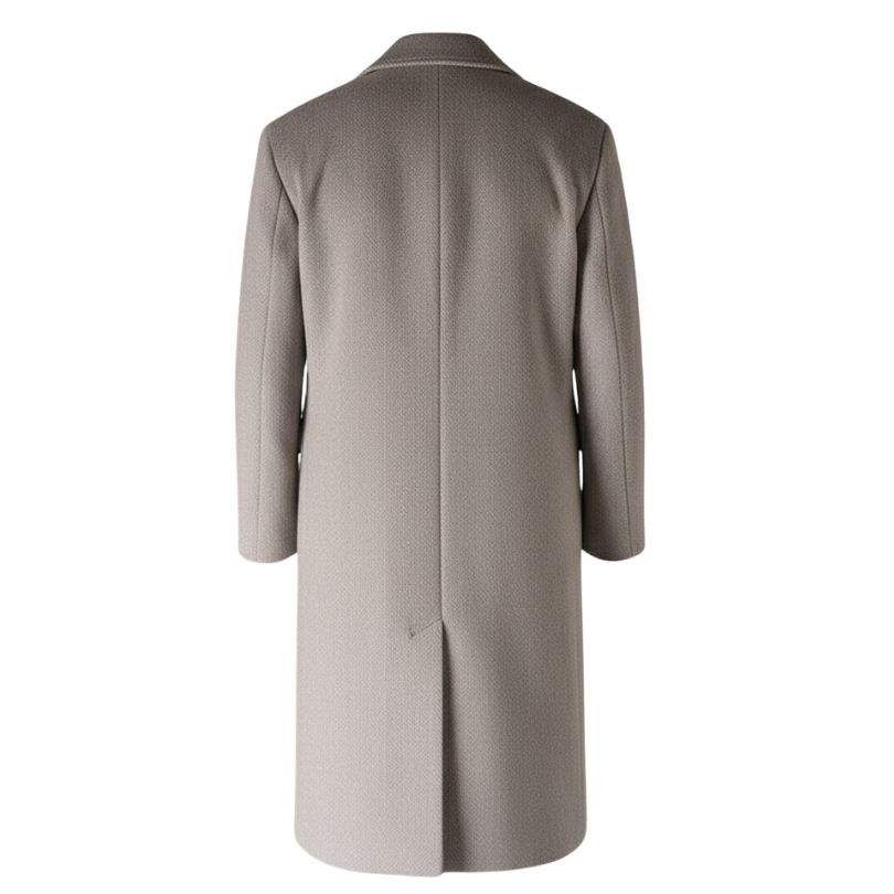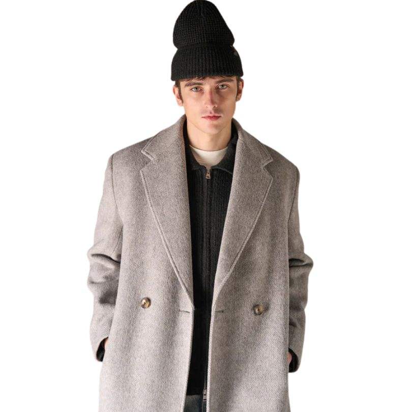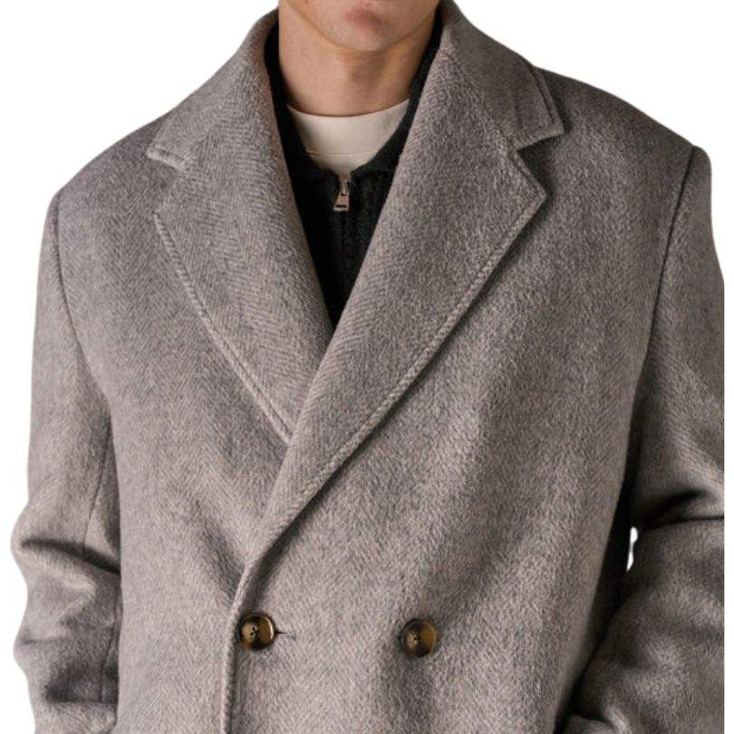 เสื้อโค้ทขนสัตว์ลายก้างปลาแบบยาวสำหรับผู้ชาย สีเทา ติดกระดุมสองแถว ดีไซน์ทันสมัยและผ้าคุณภาพสูง
