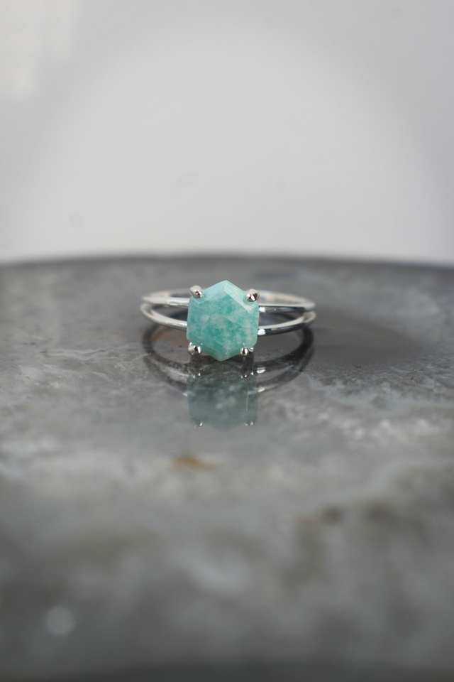 แหวนอะมาโซไนต์ทรงหกเหลี่ยมแบบสองวง แหวนเงินแท้ 925 ประดับพลอยอะมาโซไนต์ แหวนหมั้นทรงหกเหลี่ยมดีไซน์ไม่ซ้ำใคร