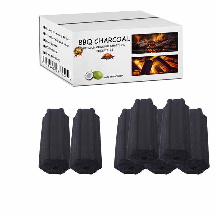 ถ่านอัดก้อนมะพร้าวธรรมชาติสีดำทรงหกเหลี่ยมประกายและไร้ควันสำหรับปาร์ตี้บาร์บีคิวกลางแจ้ง