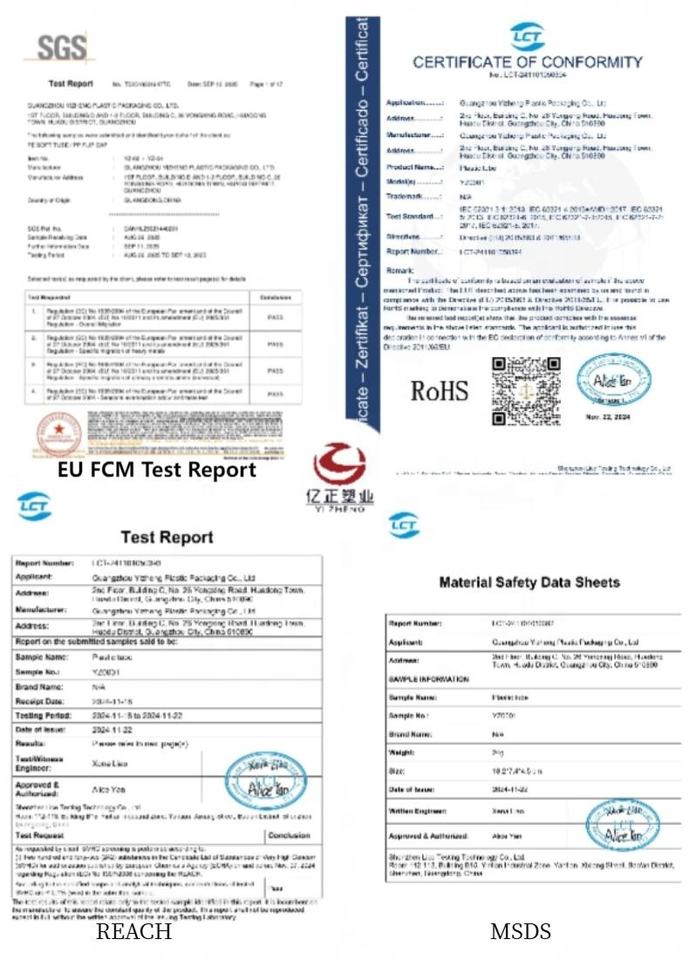รายงานการรับรอง:MSDS, REACH, RoHS, รายงานผลการทดสอบ EU FCM