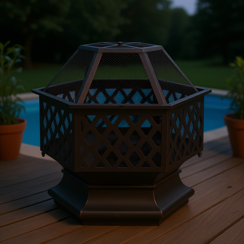 เตาไฟเหล็กทรงหกเหลี่ยมขนาด 22 นิ้ว สำหรับเผาไม้ ใช้ตั้งพื้นกลางแจ้งในสวนหลังบ้าน ใช้ริมสระน้ำ เพื่อการตกแต่ง