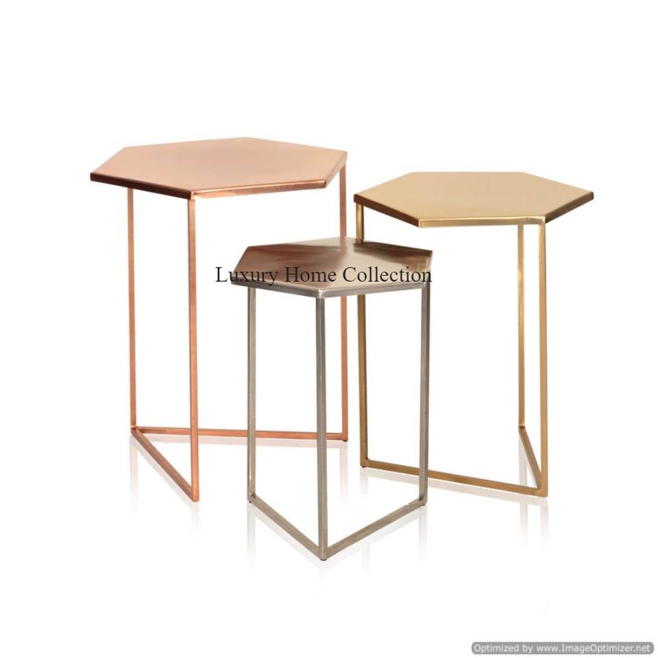 โต๊ะข้างโลหะทนทานรูปทรงหกเหลี่ยมชุดโต๊ะกาแฟและน้ำดื่มสีโรสโกลด์3ชิ้นทำจากสแตนเลส