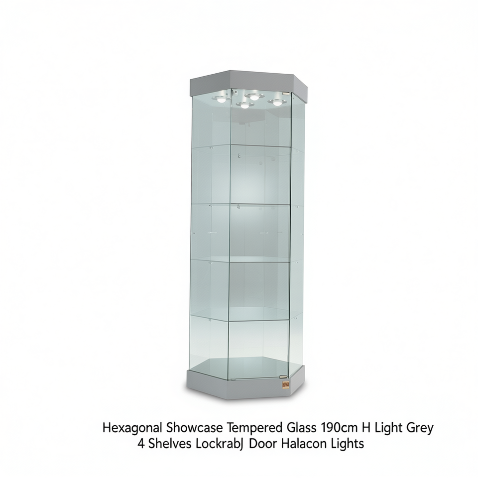 ตู้โชว์ทรงหกเหลี่ยม กระจกนิรภัย สูง 190 ซม. สีเทาอ่อน 4 ชั้นวาง ประตูล็อคได้ ไฟฮาโลเจน