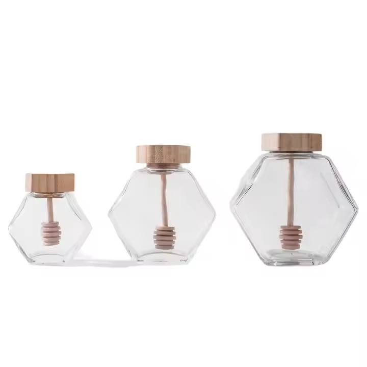 ขวดน้ำผึ้งหกเหลี่ยม, ขวดแก้ว, ฝาไม้ไผ่และไม้, 100มล., 220มล., 380มล