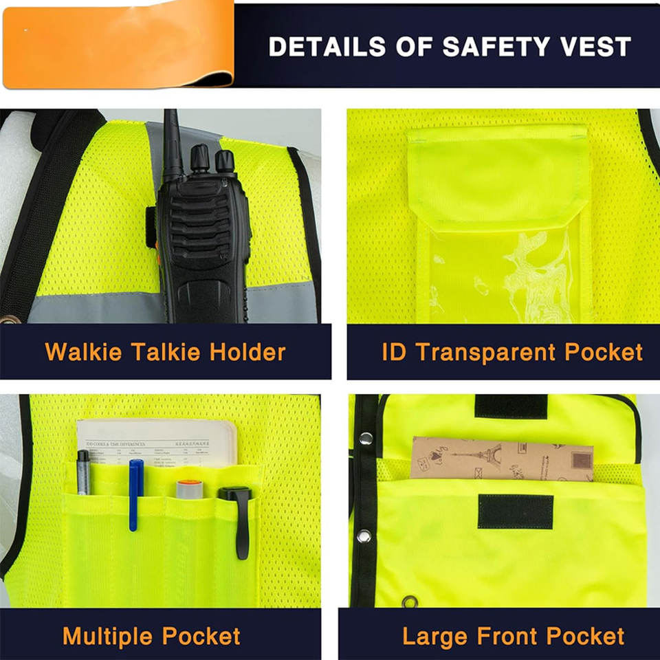 เสื้อกั๊กนิรภัยสะท้อนแสงแบบหลายกระเป๋า ขนาด S-5XL สกรีนโลโก้ได้ตามต้องการ มาตรฐาน ANSI Class 1 กันน้ำ เหมาะสำหรับวิศวกรรักษาความปลอดภัย ชุดทำงาน