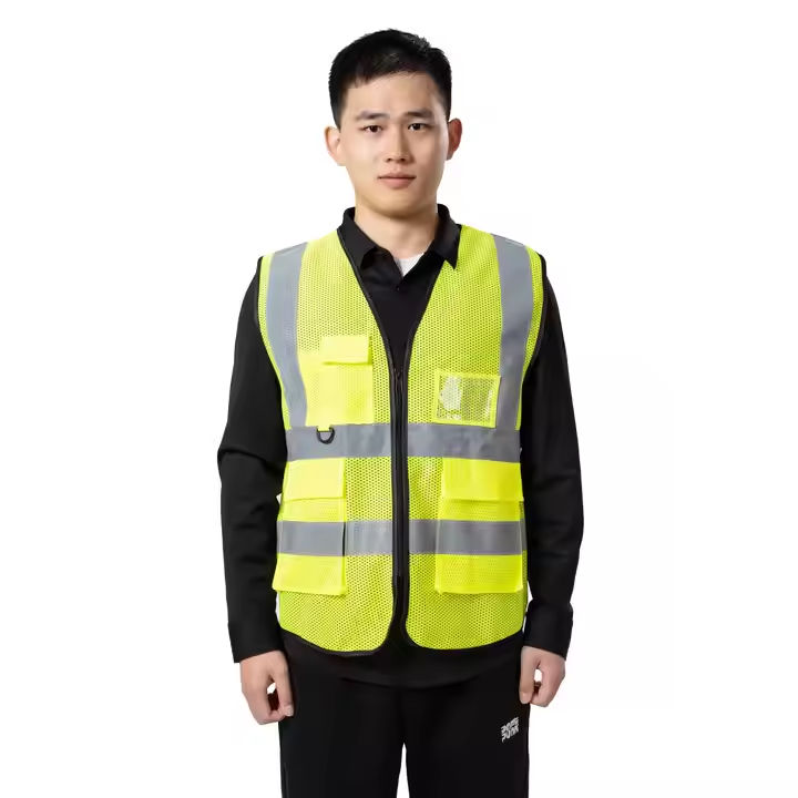 เสื้อกั๊กนิรภัยสีเหลืองสะท้อนแสง โพลีเอสเตอร์ สำหรับงานก่อสร้าง กันฝน ตาข่ายสะท้อนแสง