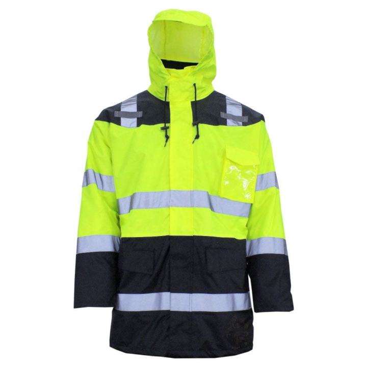 Hi-viz เสื้อแจ็กเก็ตกันฝนแขนยาวแบบสวมหัวเสื้อกั๊ก100% โพลีเอสเตอร์สะท้อนแสงปรับแต่งโลโก้ได้เสื้อผ้าคอตตอนชุดทำงานดีไซน์ใหม่ลดราคา!