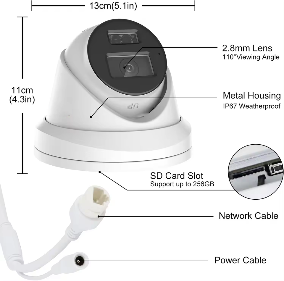 RESET, ไมโครโฟนในตัว, ในตอนกลางคืน, กันน้ำ / ฝนและแดด, มุมกว้าง, เสียงทางเดียว, ป่าเถื่อนหลักฐาน, Ir & ไฟคู่สี, ช่องเสียบการ์ด SD 256GB, WDR & DNR ที่แท้จริง, การตรวจจับมนุษย์/ยานพาหนะ, โลหะทั้งหมด