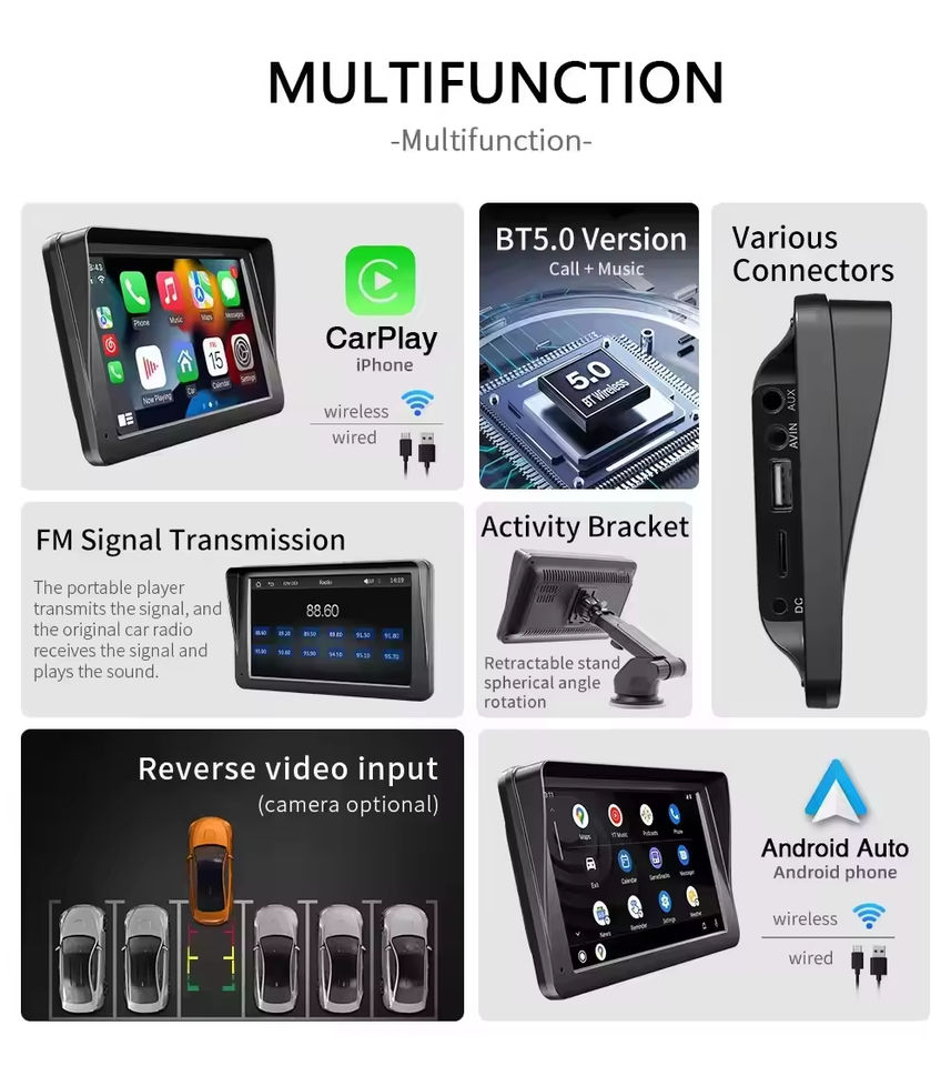 มีบลูทูธ, GPS ในตัว, เครื่องเล่นซีดี, เครื่องเล่น MP3 / MP4, เครื่องรับวิทยุ, หน้าจอสัมผัส, ทีวี, DVR, FM Transmitter, กล้องสำรอง, CD/VCD, พอร์ตAUX, HDMI เข้า/ออก, ย้อนกลับAid