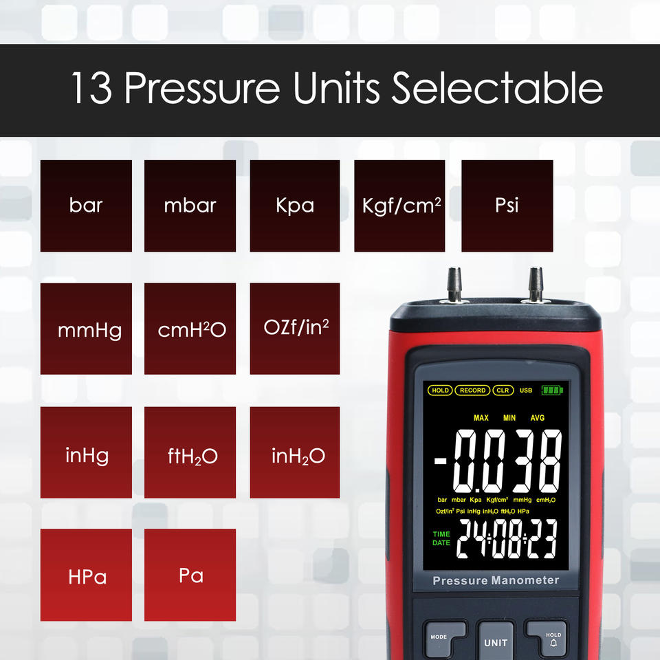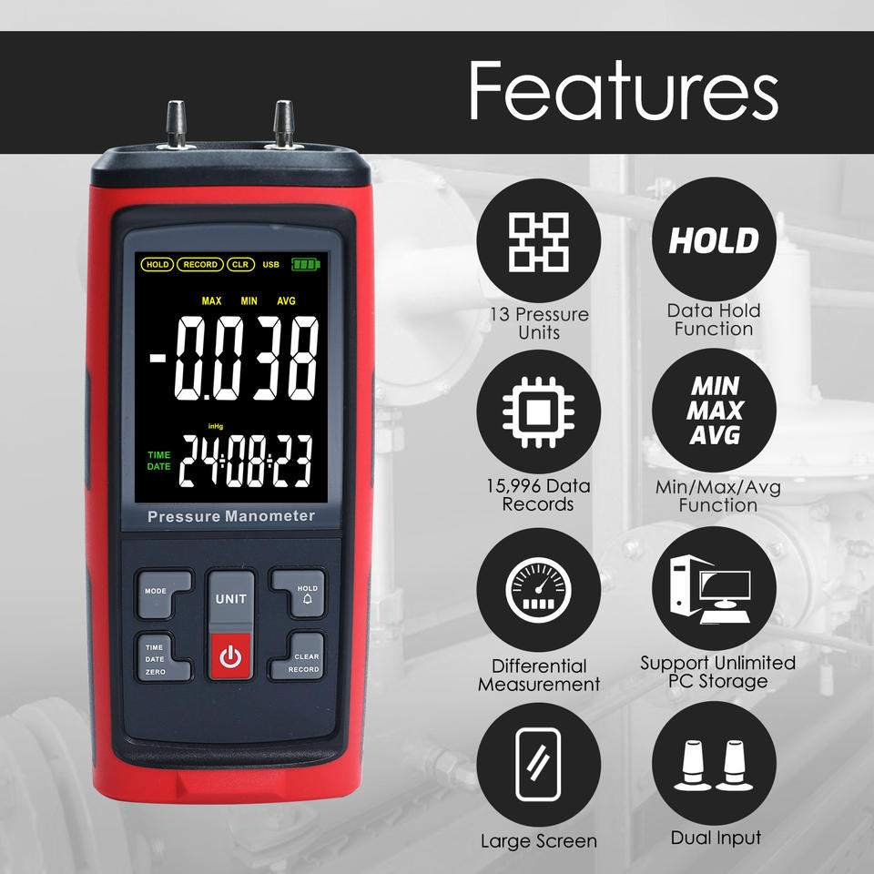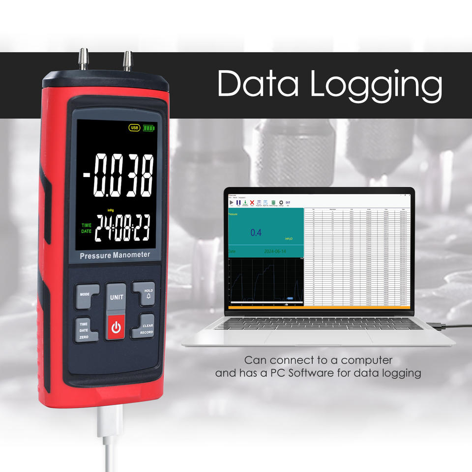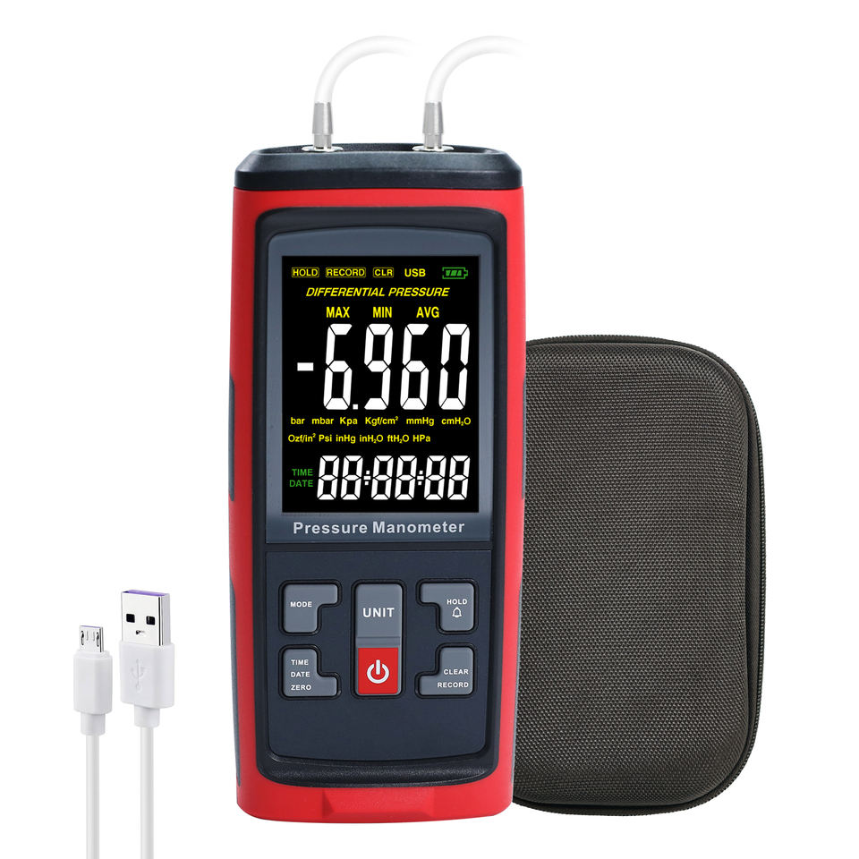 High Accuracy Portable Digital Air Pressure Gauge 50Kpa Large LCD Max Min Avg Pressure Differential Meter Datalogging Manometer
