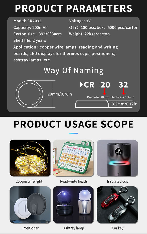 แบตเตอรี่ลิเธียมแบบเหรียญ CR2032 ความจุสูง 3V 200mAh ได้รับการรับรองมาตรฐาน CE ROHS สำหรับอุปกรณ์อิเล็กทรอนิกส์สำหรับผู้บริโภค เครื่องใช้ไฟฟ้าในบ้าน ของเล่น และรีโมท