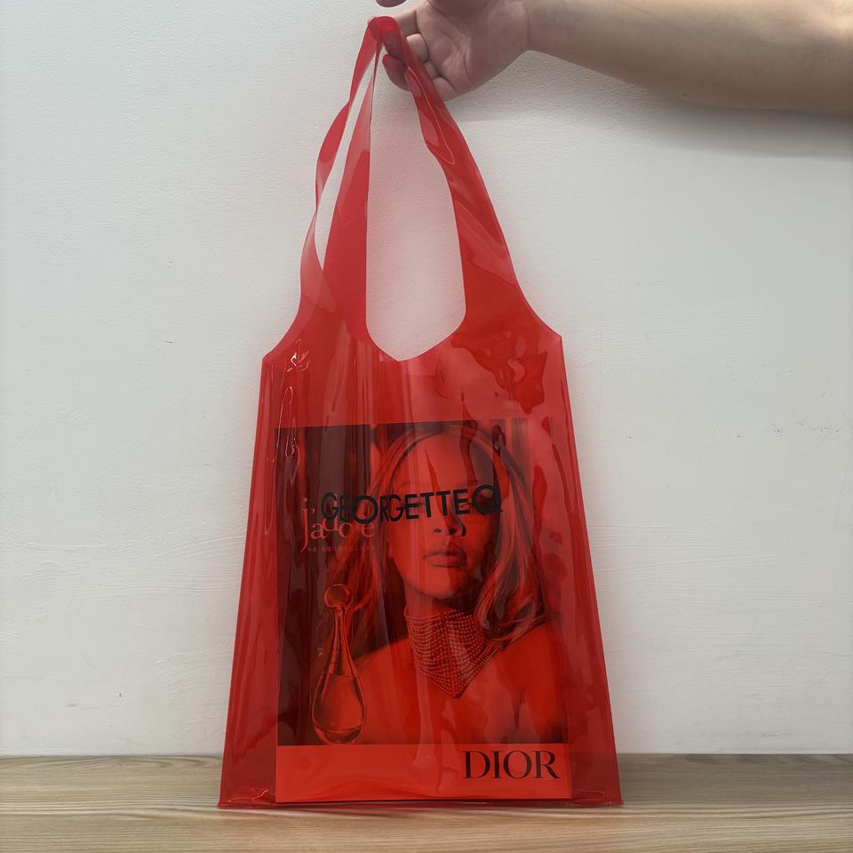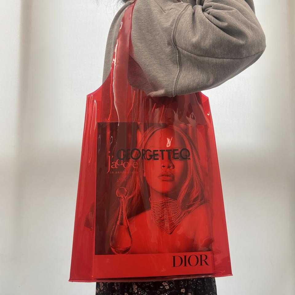 กระเป๋าแฟชั่นพีวีซีใสสีแดงความจุสูงพิมพ์โลโก้ที่กำหนดเองสำหรับช้อปปิ้ง