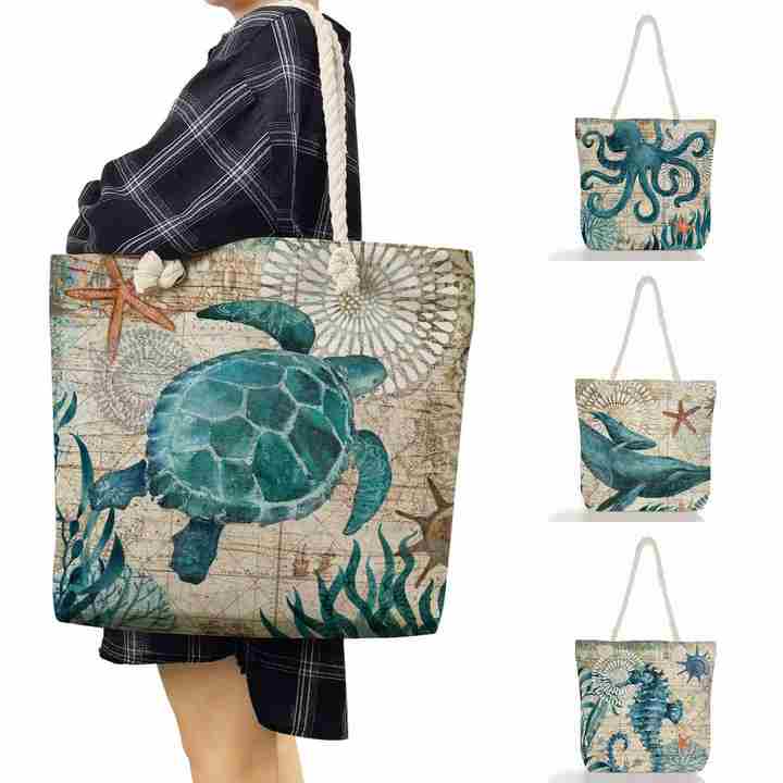 High Capacity Travel Beach Bag Whale Hippocampus Tote Bag Turtle Octopus Print Handbag Women Shoulder Bag Eco Shopping Tote