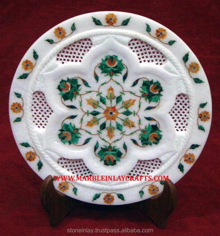 จานทรงกลมสำหรับตกแต่งโรงแรมและบ้านจานหินอ่อนฝังลายดอกไม้หินอ่อนสีขาวสำหรับตกแต่งโรงแรมและบ้าน