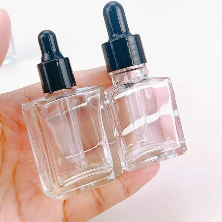 ขวดหยดทรงสี่เหลี่ยมใสขนาด 15 มล. ก้นหนา รูปทรงแบน สำหรับเซรั่มบำรุงผิว พร้อมกล่องบรรจุภัณฑ์ทรงสี่เหลี่ยม
