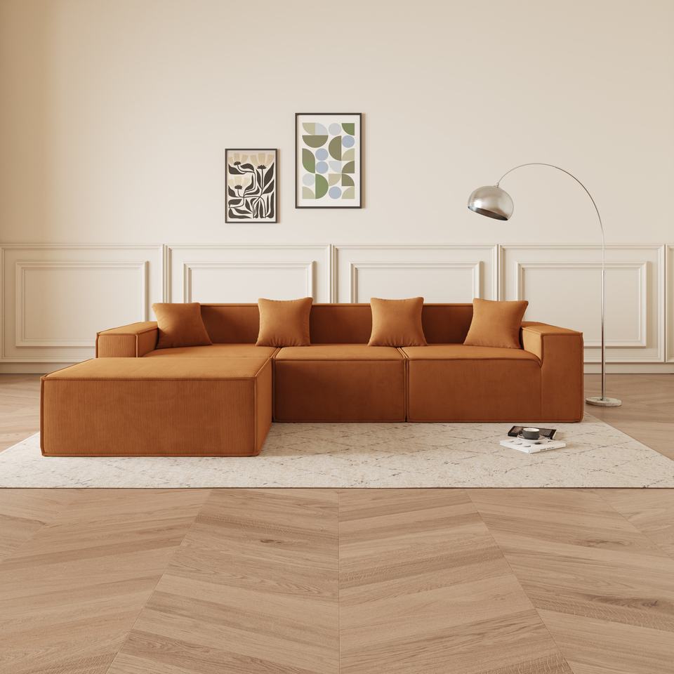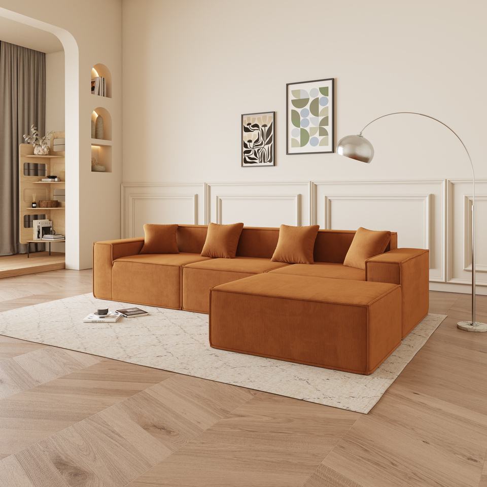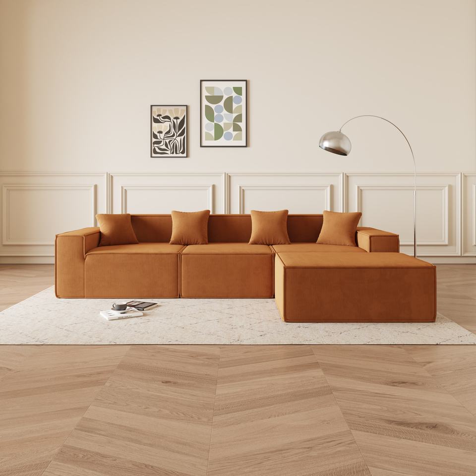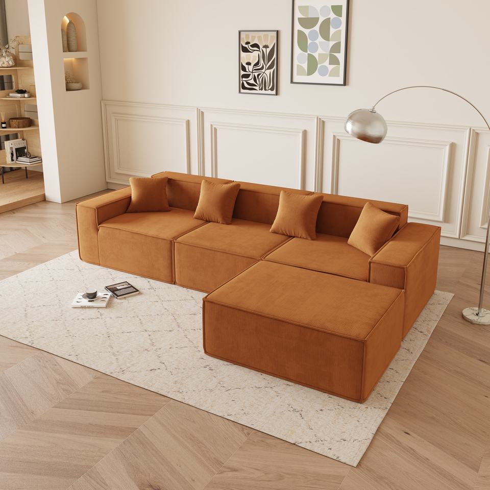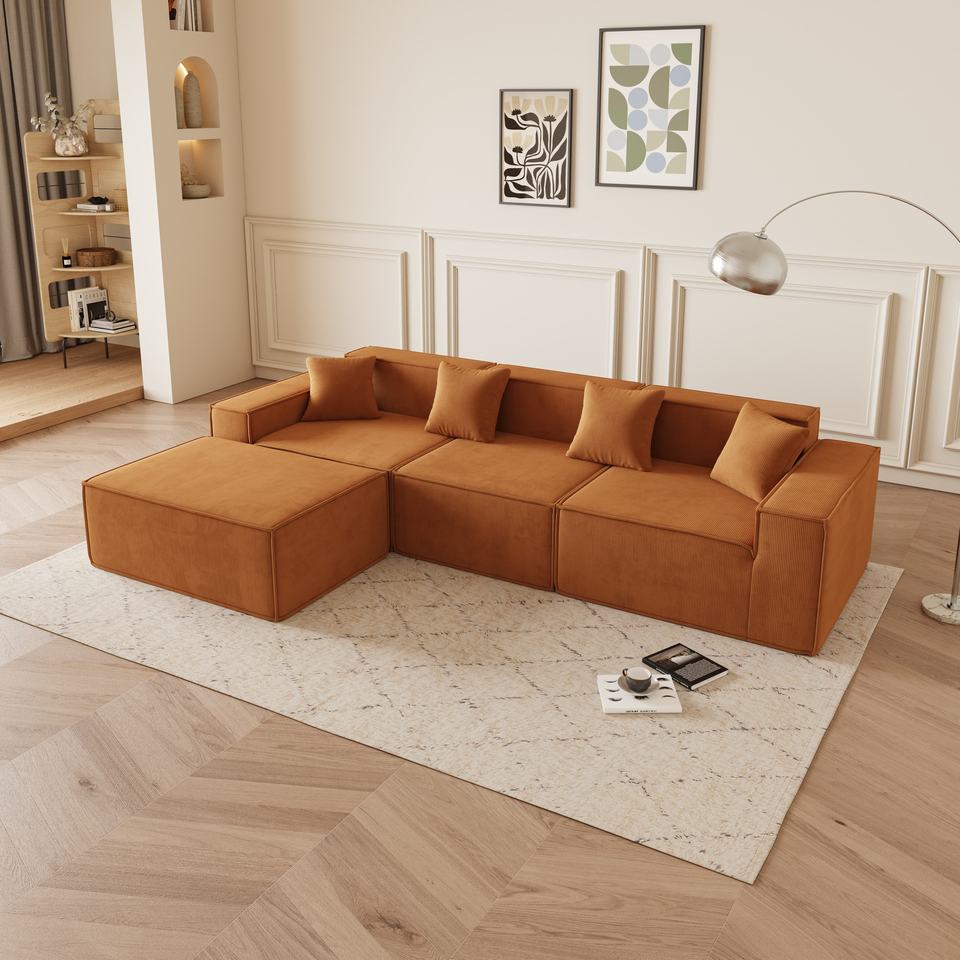 โซฟาเข้ามุมทรงสี่เหลี่ยมผ้ากำมะหยี่สีส้มอัดแน่น พร้อมออตโตมัน สไตล์โมเดิร์นหรูหรา หุ้มเบาะแบบทัฟท์ สำหรับอพาร์ทเมนต์