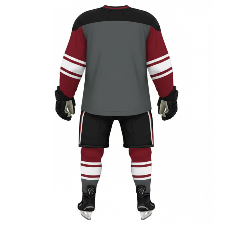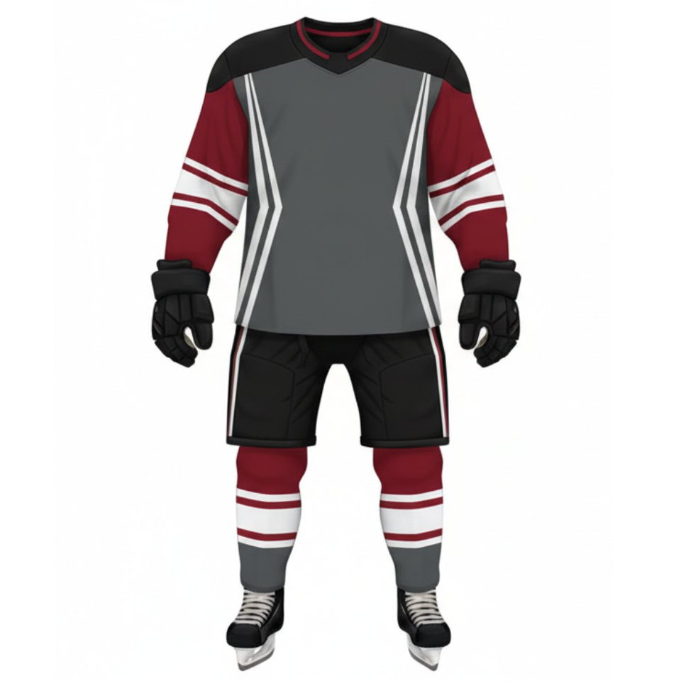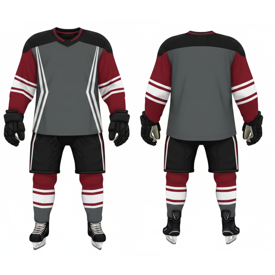 ชุดฮอกกี้น้ำแข็งสำหรับผู้ชาย ยอดนิยม - สีเทาเข้ม สีแดงเลือดหมู สีขาว ลายเรขาคณิต - ชุดกีฬาแบบซับลิเมชั่นเต็มตัวสำหรับทีม