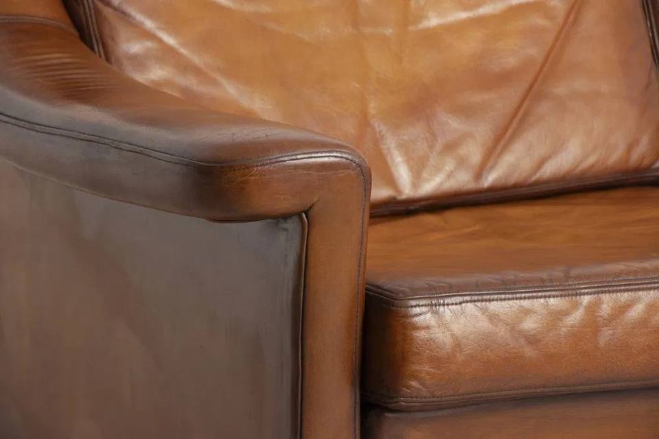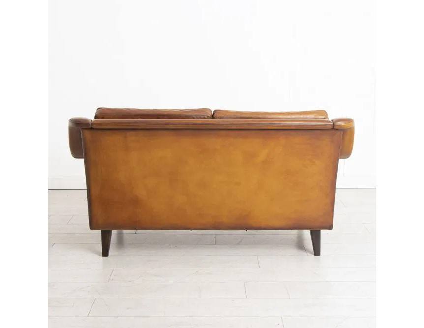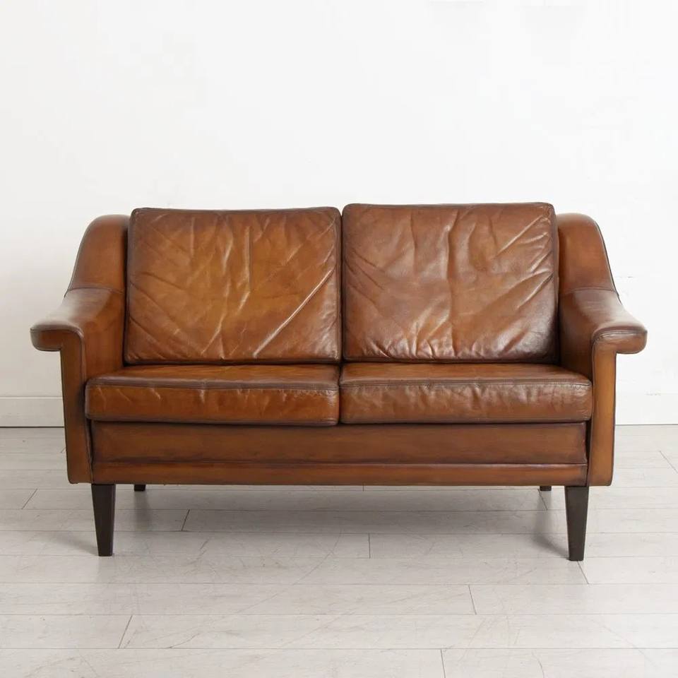 โซฟาสองที่นั่งสไตล์โมเดิร์นกลางศตวรรษของสวีเดน ยอดนิยม พร้อมเบาะหนังสีคอนยัคทำมือและโครงไม้เนื้อแข็ง
