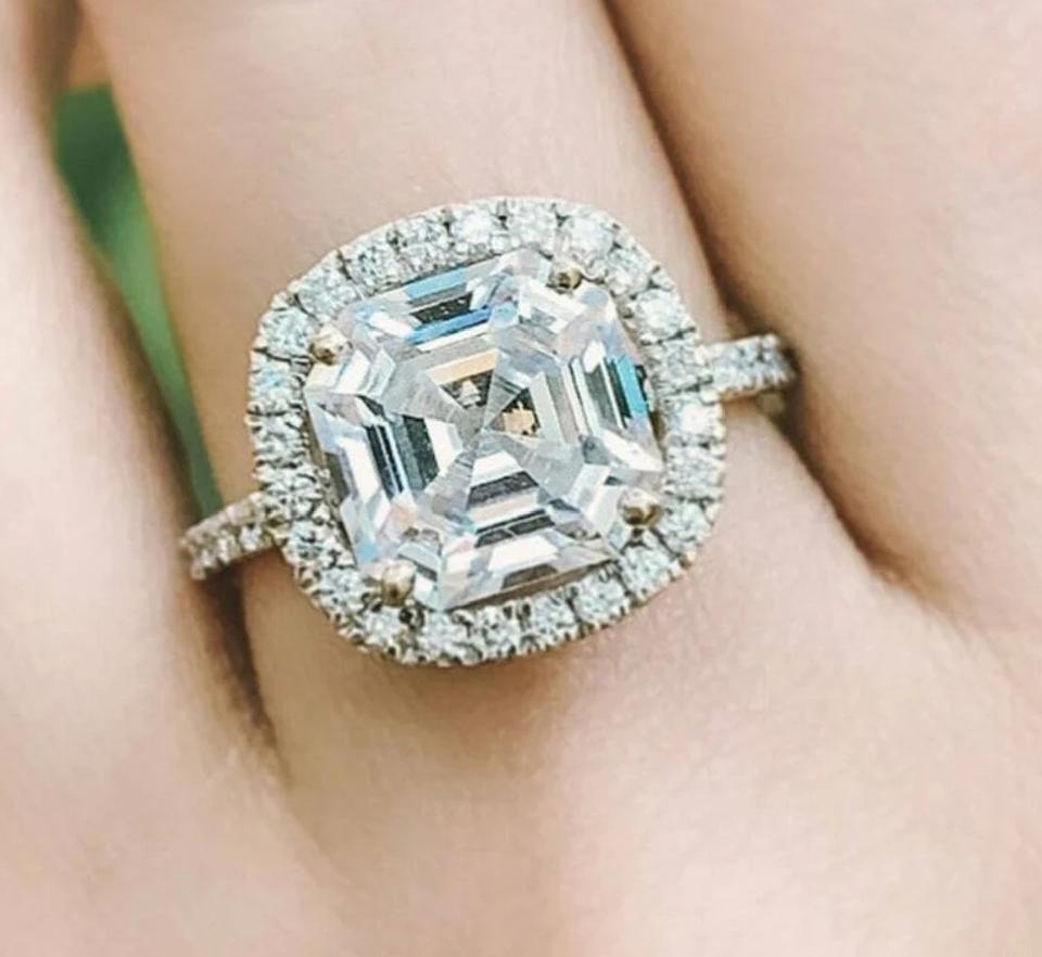 แหวนเพชรทรงแอสเชอร์แบบ Halo ที่ได้รับความนิยมสูง ผลิตในห้องปฏิบัติการ ตัวเรือนทองคำแท้ 14K ประดับเพชรแบบ Pave Setting แหวนหมั้นสุดหรู