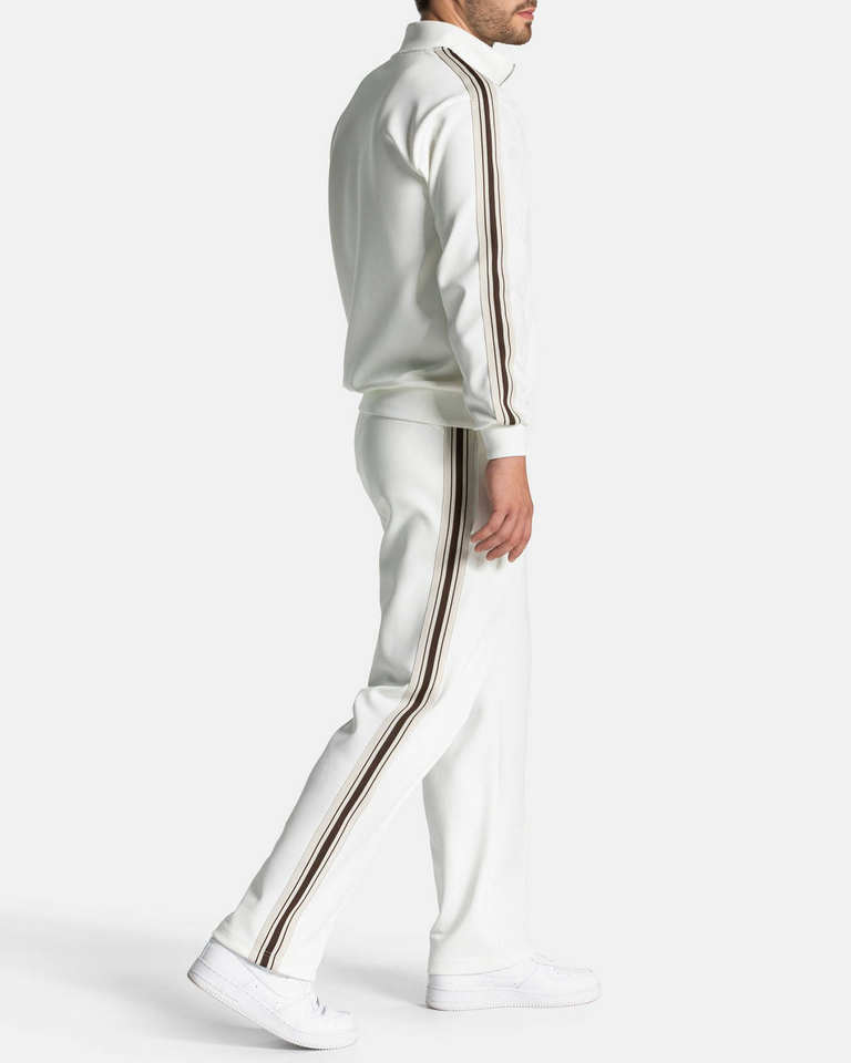ชุดวอร์มผู้ชายแบบสองชิ้น เสื้อฮู้ดซิปสีขาวลายทางและกางเกงขายาว ระบายอากาศได้ดี เหมาะสำหรับออกกำลังกาย เป็นที่ต้องการอย่างมาก