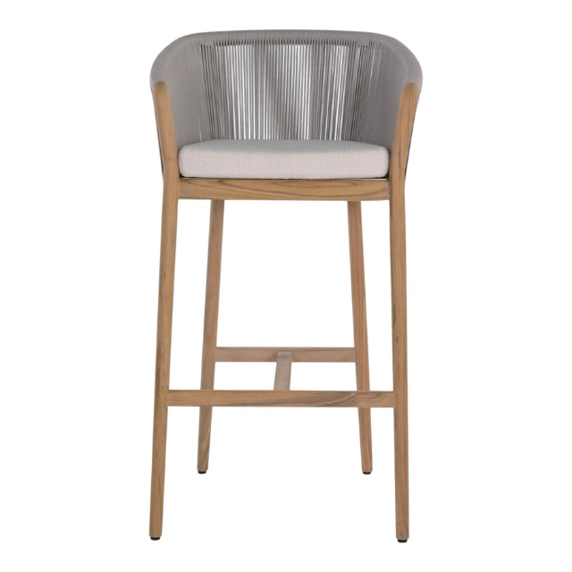 เก้าอี้บาร์เชือกถักกลางแจ้งหุ้มด้วยโฟมความหนาแน่นสูง โครงไม้สักแท้ สำหรับตกแต่งบ้าน