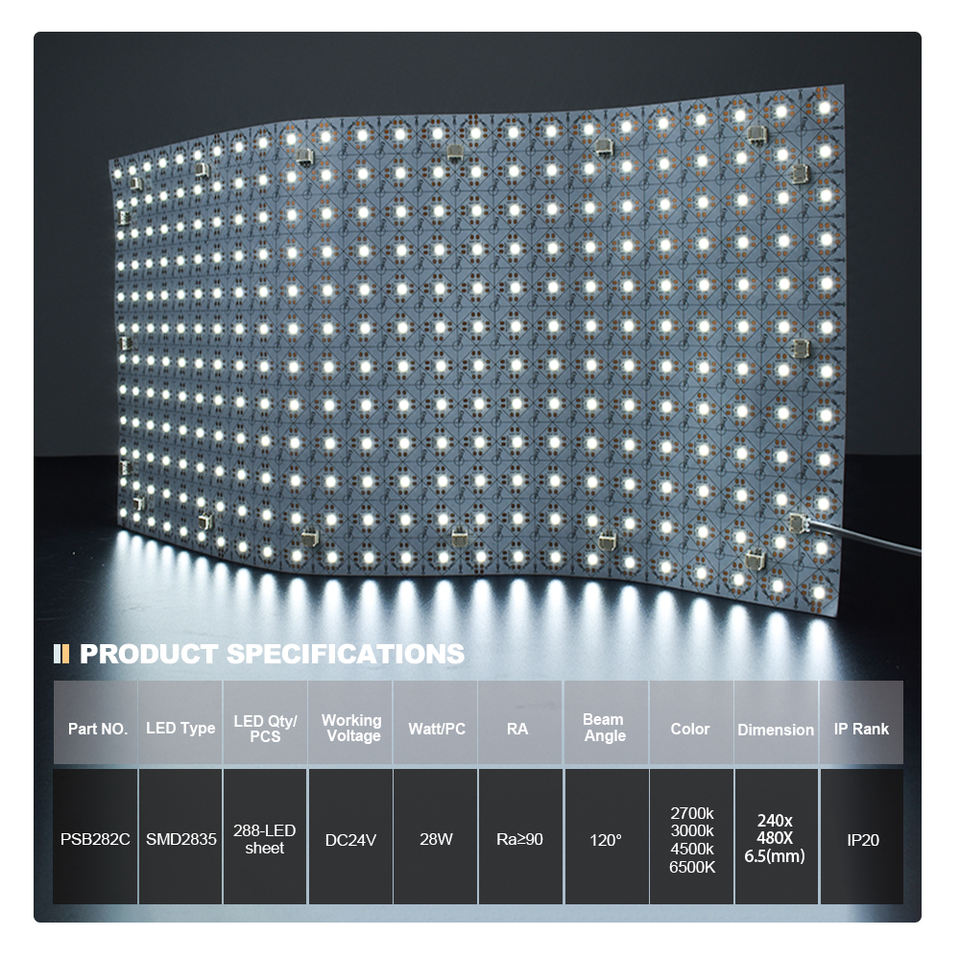 แผงไฟ LED ความหนาแน่นสูง SMD2835 288 ดวง DC 24V 28W ต่อแผ่น ค่า CRI สูง Ra 90 120 ° ลำแสง 4 แบบ CCT คงที่ สำหรับแสงสว่างระดับมืออาชีพ