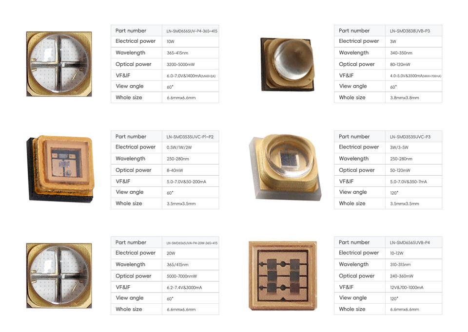 หลอดไฟ LED UVC 3535 ประสิทธิภาพสูง 1 วัตต์ 260-270 นาโนเมตร 20-30 มิลลิวัตต์ 100-150 มิลลิแอมป์ ไดโอด LED 5-7 โวลต์ แบบ Flip Chip (PW, Dowa หรือ UVH) สำหรับเครื่องฟอกอากาศและน้ำ