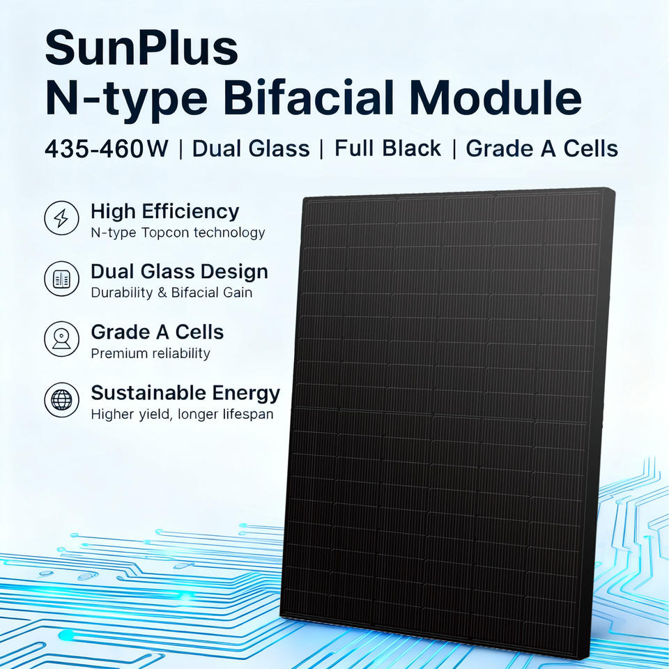 แผงโซลาร์เซลล์แบบ N-Type สองหน้า ประสิทธิภาพสูง 455 วัตต์ สำหรับเซลล์แบบ Half Cell | กระจกสองชั้นสีดำทั้งหมด | ตลาดยุโรป 23% | ซันพลัส 12 ปี