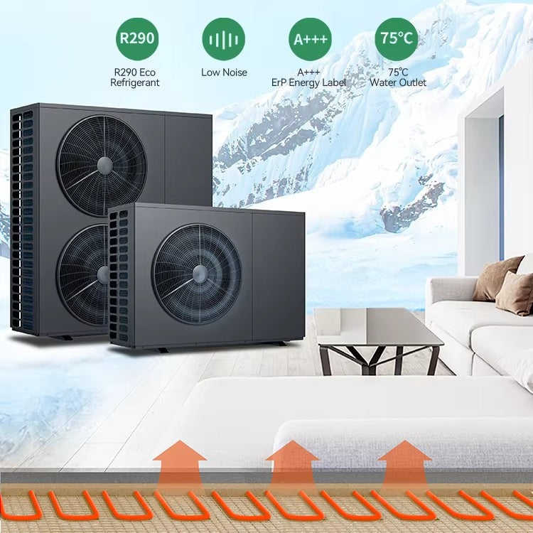 อินเวอร์เตอร์ประสิทธิภาพสูง 6KW 16KW ปั๊มความร้อนอากาศสู่น้ำ ระบบ HVAC สำหรับบ้าน โรงแรม บ้านพักอาศัย โรงงาน ประเทศโปแลนด์ สาธารณรัฐเช็ก สีดำ มาตรฐาน EU