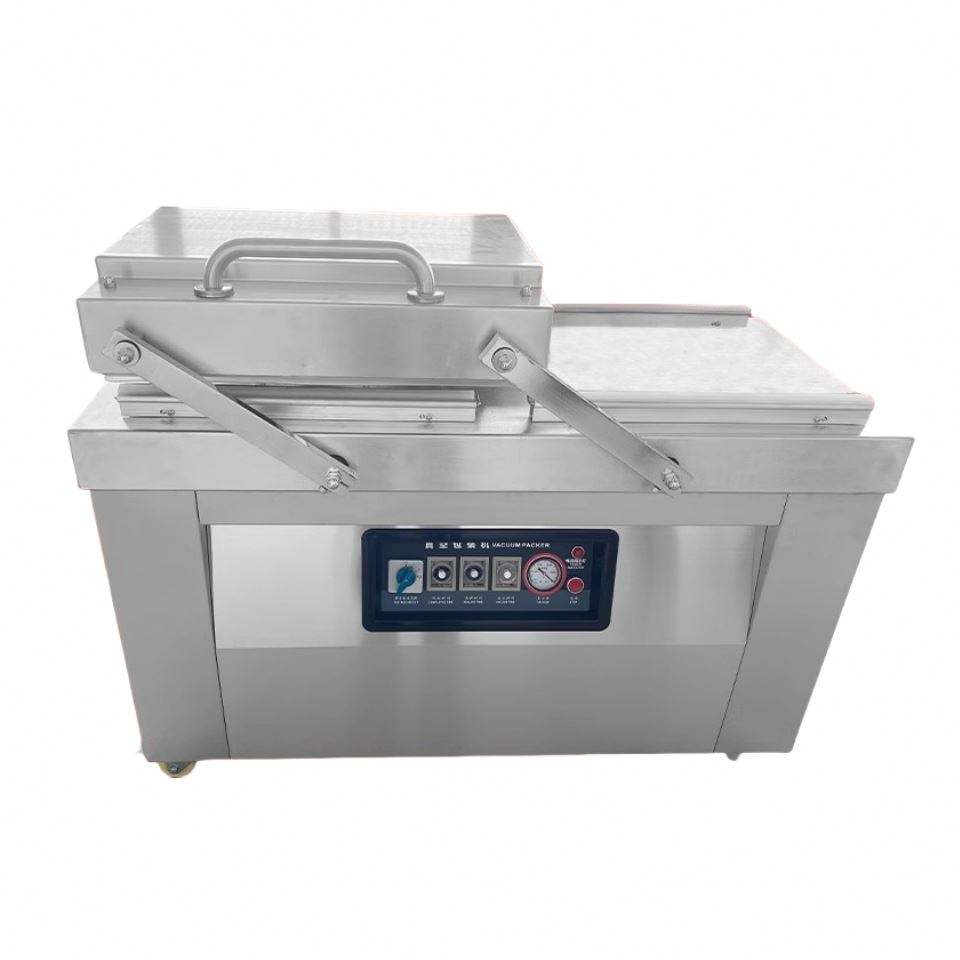 เครื่องซีลสูญญากาศแบบสองห้องประสิทธิภาพสูงสำหรับอาหารแช่แข็ง ปลา บรรจุภัณฑ์ไม้แบบตั้งโต๊ะ สำหรับกระดาษและแก้ว