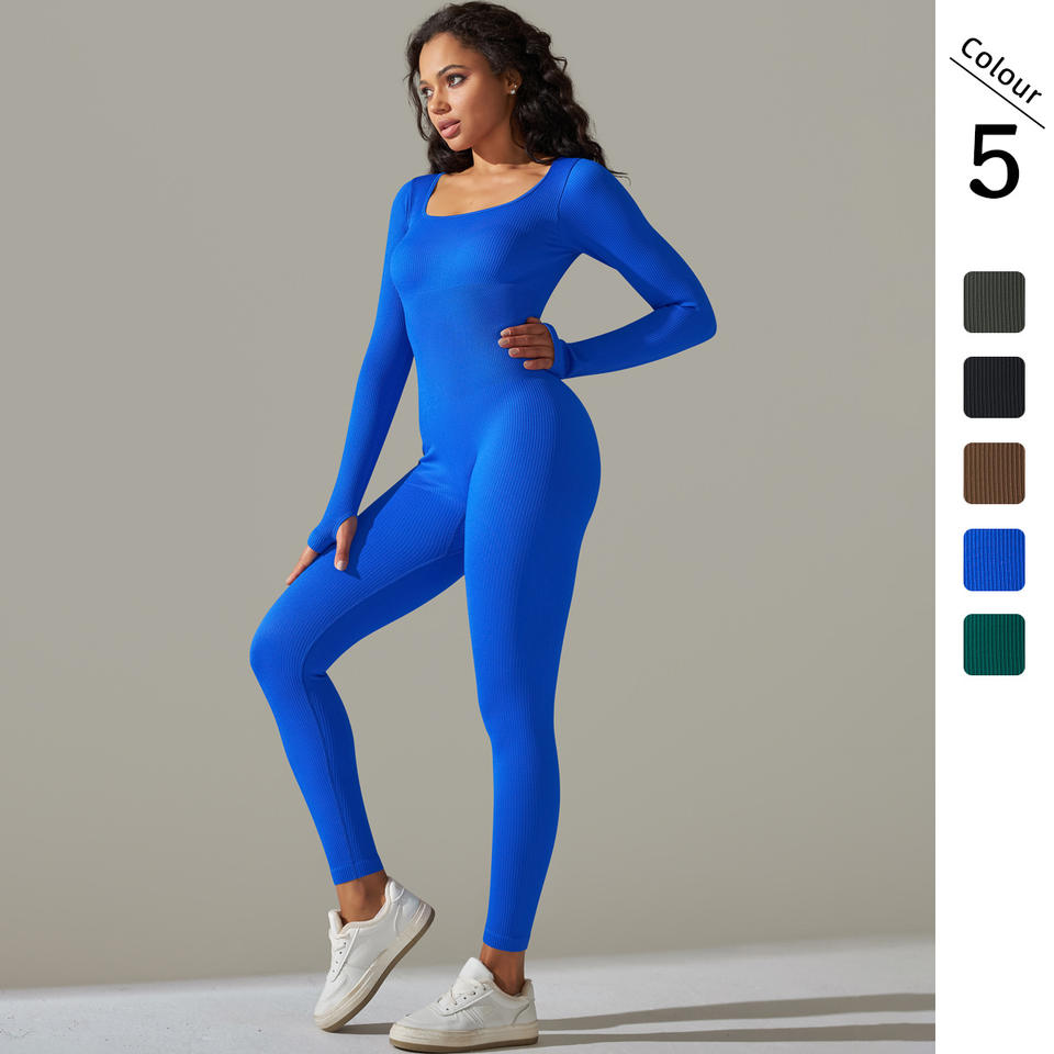 จั๊มสูทเล่นกีฬาข้ามพรมแดนแบบยืดหยุ่นสูงชุดเล่นโยคะฟิตเนสแขนยาวรัดรูปสีพื้นสำหรับใส่วิ่ง
