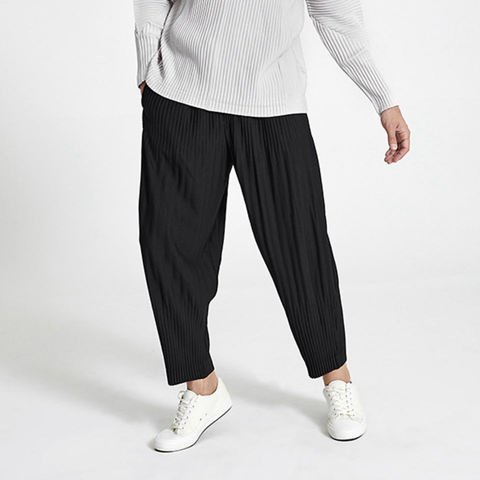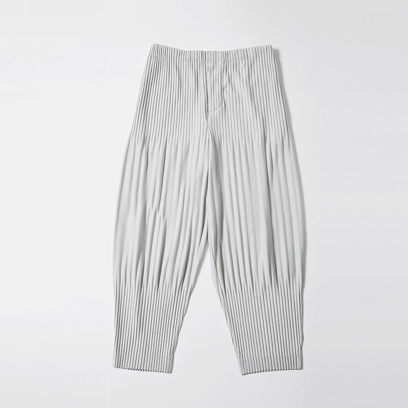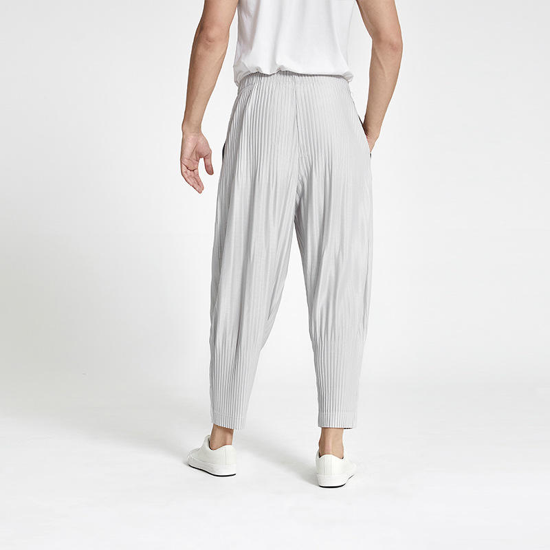กางเกงพลีท Miyake ยืดหยุ่นสูง สไตล์ลำลองสำหรับผู้ชาย ทรงหลวม ไซส์ใหญ่ แมทช์ได้กับทุกชุด กางเกงทรงโคมไฟ ดีไซน์เนื้อผ้ามีเท็กซ์เจอร์