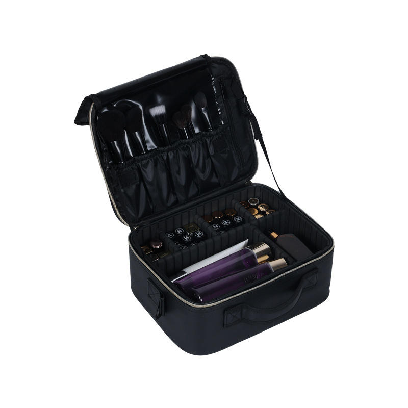 กระเป๋าเก็บแปรงแต่งหน้าสีดำระดับไฮเอนด์ ความจุขนาดใหญ่ สีพื้น วัสดุ PVC หูจับนุ่ม ปิดแบบพลิก ใช้ได้ทุกวัน สำหรับใส่เครื่องสำอาง