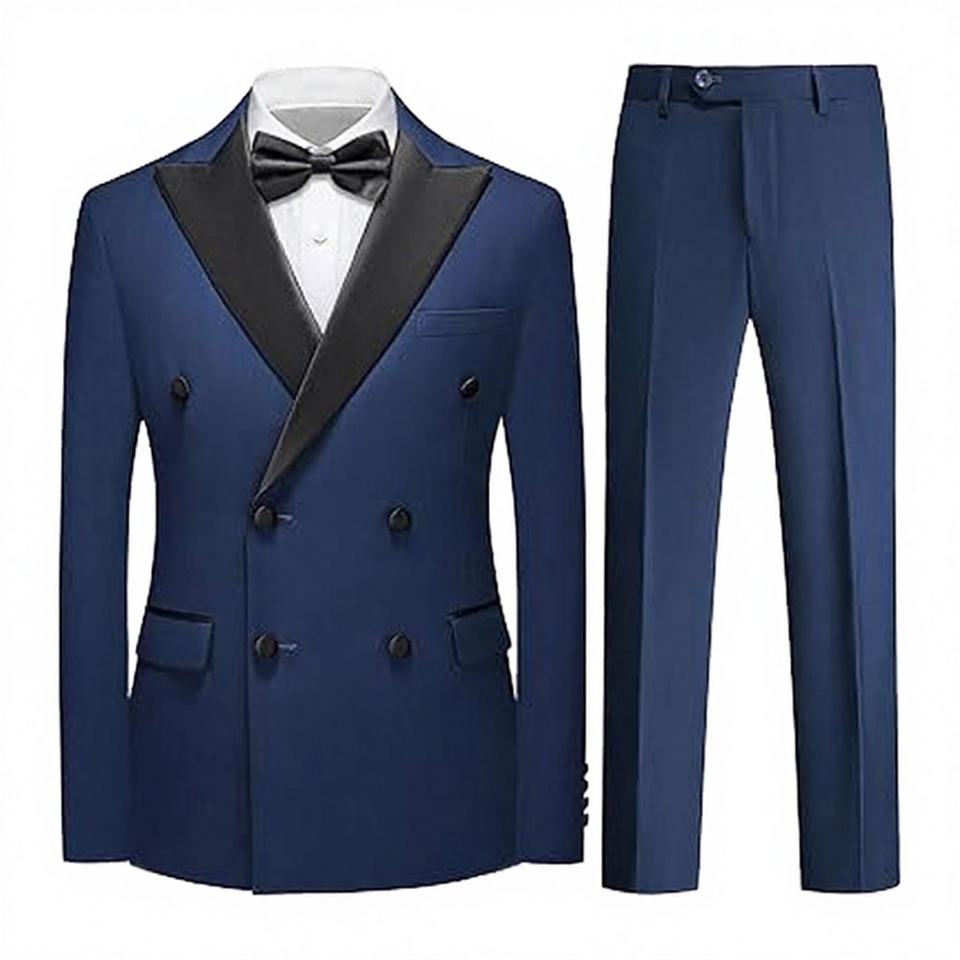 ชุดสูทผู้ชายผ้าขนสัตว์ระบายอากาศได้ดีระดับไฮเอนด์ แบบสั่งตัดได้ 2 ชิ้น ชุดทักซิโด้ปกคลาสสิก กระดุมสองแถว สีน้ำเงินกรมท่า ติดกระดุมแบบ Fly