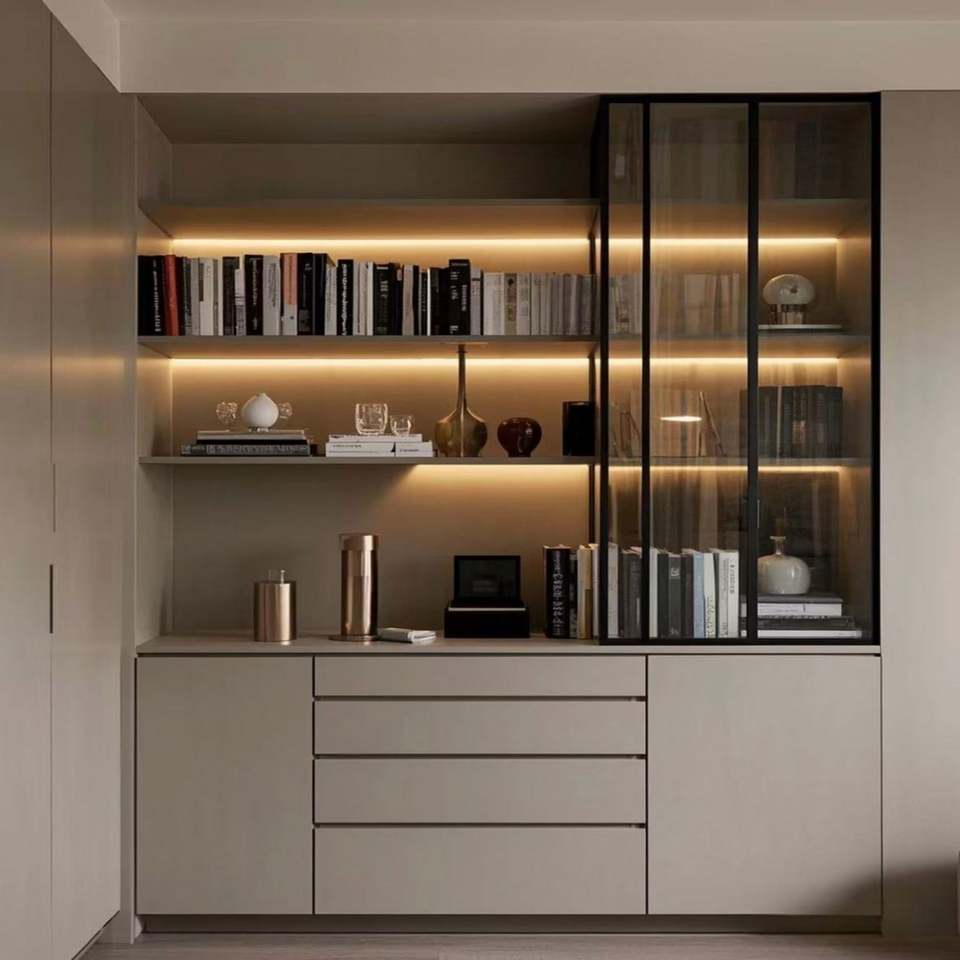 ตู้หนังสือสำนักงานในบ้านแบบฝังตัวระดับไฮเอนด์ - ไม้วอลนัทและกระจก, ไฟ LED + โต๊ะทำงาน, ตู้จัดระเบียบหลายโซนสำหรับบ้านหรูทันสมัย