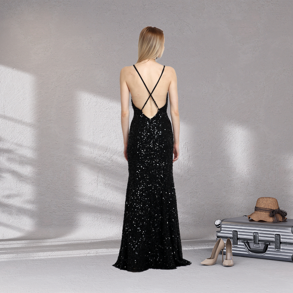 ชุดราตรีนางเงือกสุดหรูเดรสผ้าทูลคอวีลึกและสายรัดสปาเก็ตตี้สำหรับงานพรอมผู้หญิงและงานกลางคืน