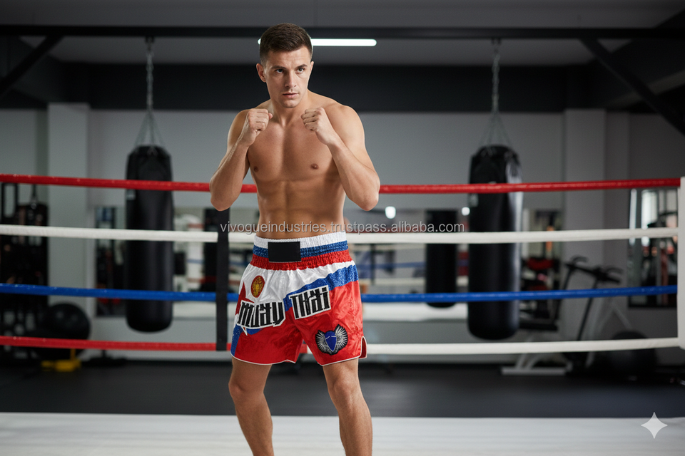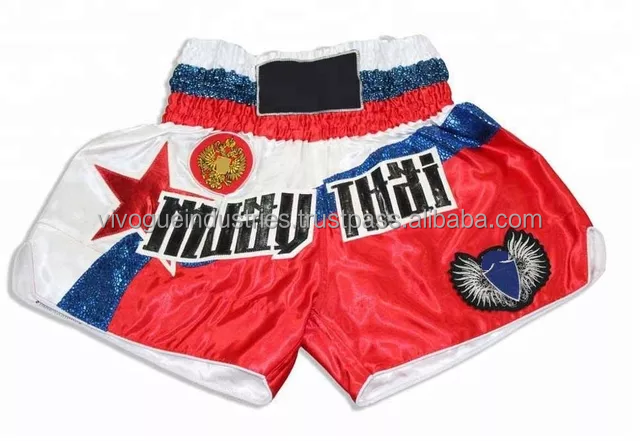 กางเกงมวยไทยปักลายและปะผ้าแบบสั่งทำพิเศษ พร้อมโลโก้ด้านหน้า ผลิตจากโพลีเอสเตอร์ 100% แห้งเร็วและระบายอากาศได้ดี