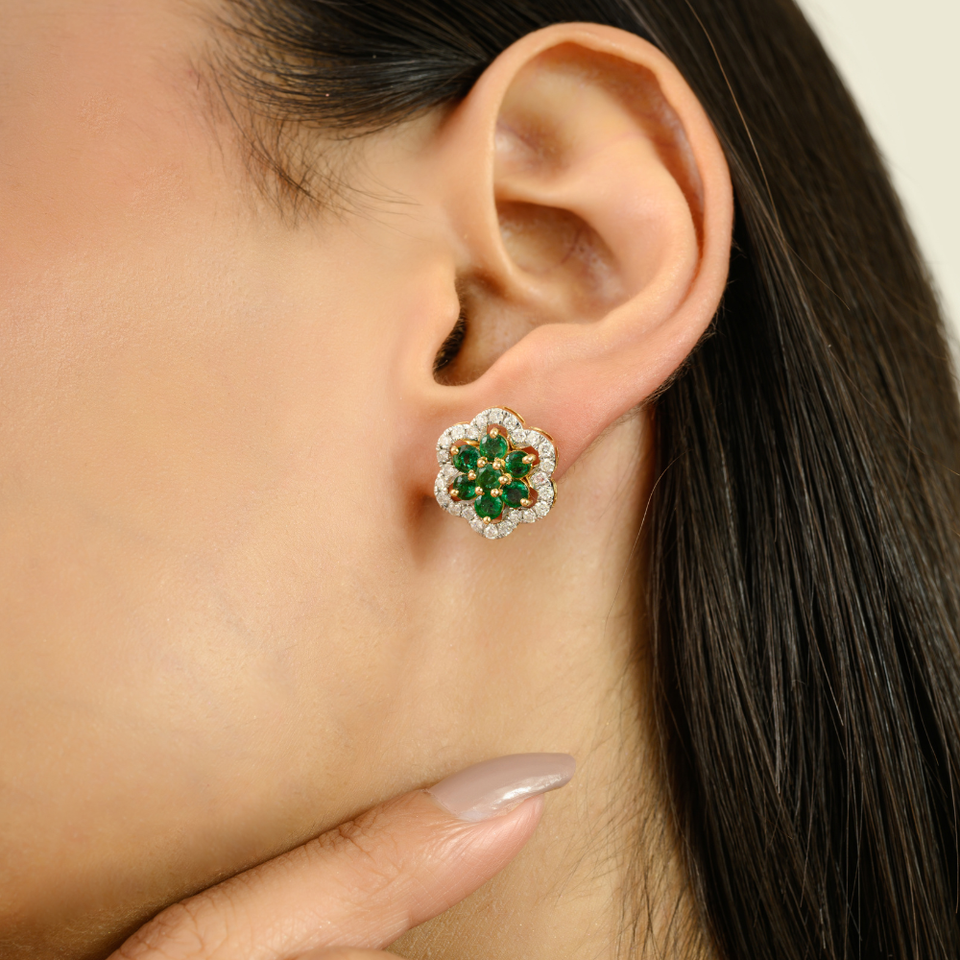 เครื่องประดับสำหรับนักออกแบบชั้นสูงต่างหูเม็ดกลมสีทองและมรกตเจียระไนตามธรรมชาติ18K รูปทรงดอกไม้สีเหลืองทองแท้