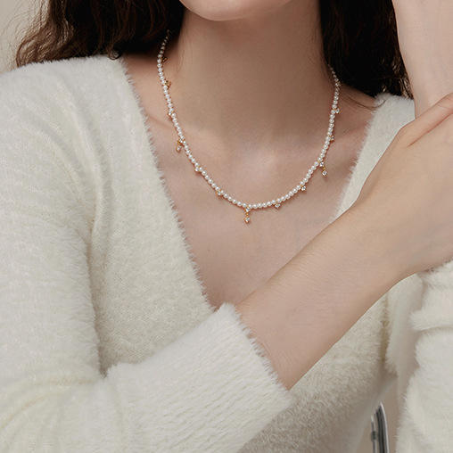 สร้อยคอมุกน้ำจืดฝังไมโครเมทีโอเรียแบบฝรั่งเศสสุดหรู ดีไซน์ทรงกลมอเนกประสงค์ ฝังไมโครเมทีโอเรีย ให้ความรู้สึกหรูหรา