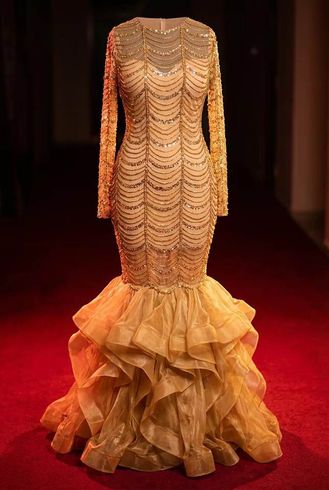 ชุดราตรีทรงเมอร์เมดประดับลูกปัดทองหรูหรา แขนยาว ชุดสำหรับงานเลี้ยงตอนเย็น ชุดเจ้าสาวสำหรับงานต้อนรับ รับสั่งตัดตามแบบ ขายส่ง