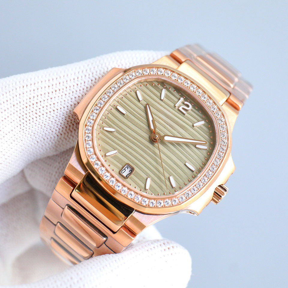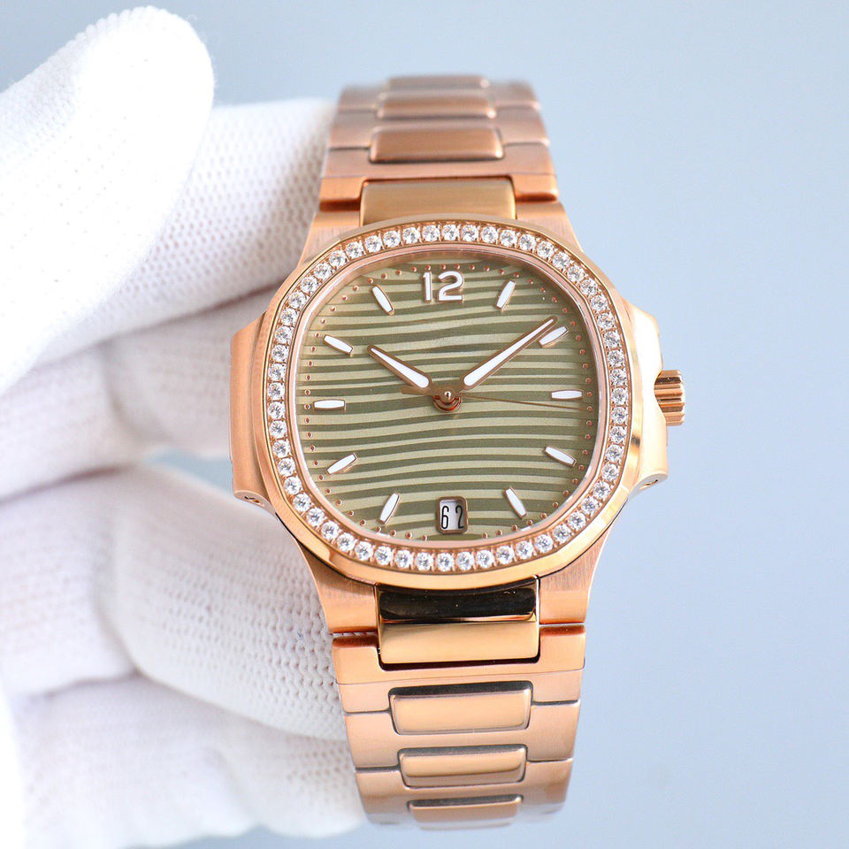 นาฬิกาข้อมือผู้หญิงเกรดพรีเมียมสีโรสโกลด์ ประดับเพชรเต็มกรอบ หน้าปัดสีเขียวมะกอกลายคลื่น พร้อมช่องแสดงวันที่ ดีไซน์หรูหรา เหมาะสำหรับใส่ในชีวิตประจำวันและงานปาร์ตี้